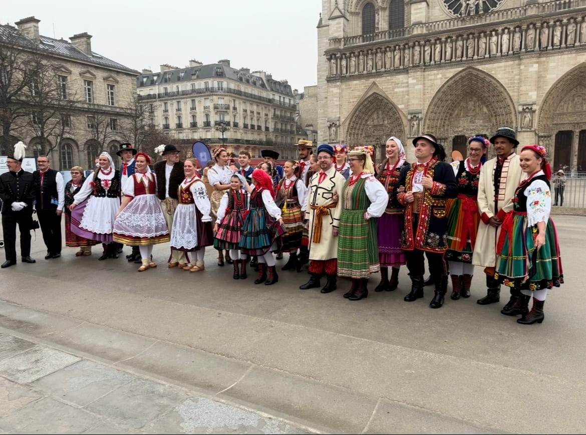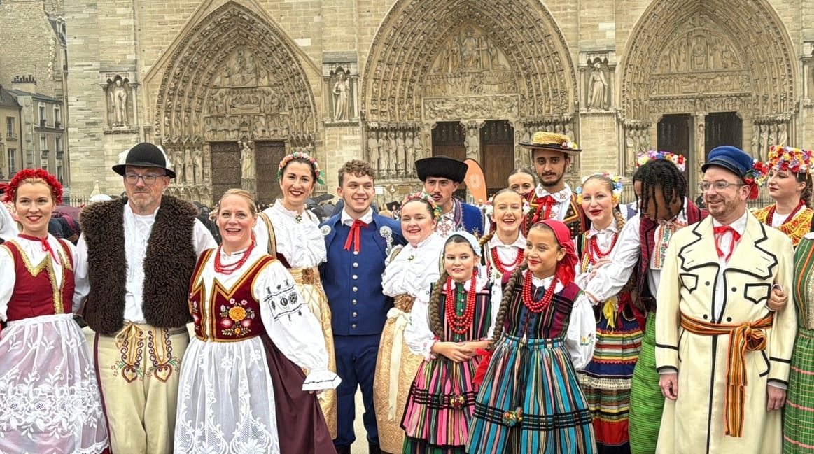 Przed katedrą zgromadziły się liczne grupy Polonii francuskiej, które zadbały o wyjątkową oprawę wizualną. Stroje z różnych regionów Polski – od krakowskich gorsetów po podhalańskie pasy i wianki – stworzyły barwną mozaikę tradycji. Kolorowe hafty i koraliki kontrastowały z szarym niebem, a obecność dzieci w strojach ludowych podkreśliła międzypokoleniowy charakter uroczystości.