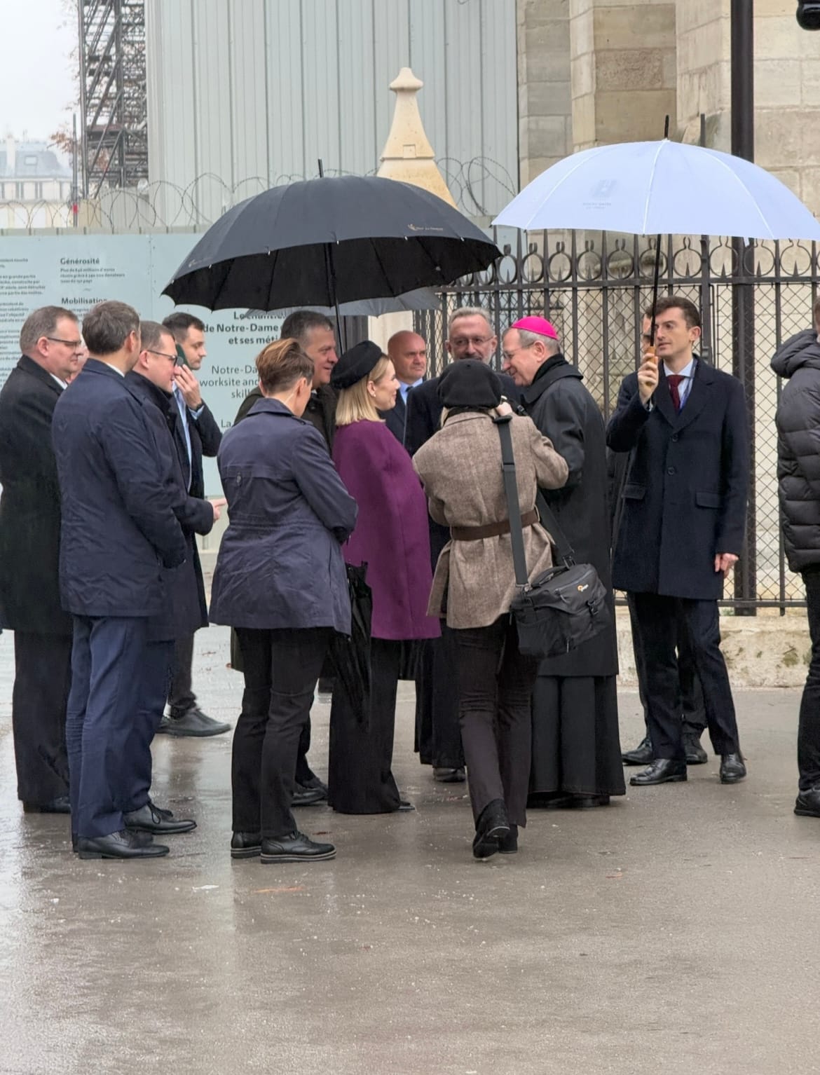 Przed Katedrą Notre-Dame Pierwszą Damę Martę Nawrocką i polską delegację wita bp Tadeusz Wojda, przew. KEP. Dziś uroczystość inauguracji Kaplicy Polskiej i ponownego wprowadzenia do niej Ikony Matki Bożej Częstochowskiej, po pożarze z 2019r. pic.twitter.com/b6SDzqoP3B