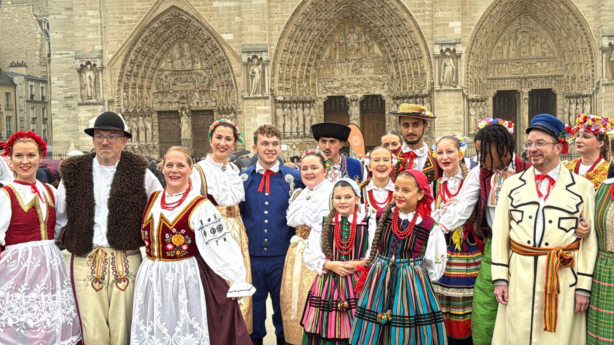 Przed katedrą zgromadziły się liczne grupy Polonii francuskiej, które zadbały o wyjątkową oprawę wizualną. Stroje z różnych regionów Polski – od krakowskich gorsetów po podhalańskie pasy i wianki – stworzyły barwną mozaikę tradycji. Kolorowe hafty i koraliki kontrastowały z szarym niebem, a obecność dzieci w strojach ludowych podkreśliła międzypokoleniowy charakter uroczystości.