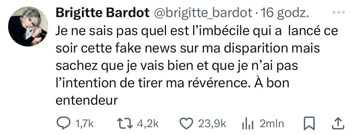 O śmierci aktorki donosił młody, 27 - letni internetowy influencer. Post został potem skasowany. Influencer twierdził, że ma ekskluzywne wiadomości o niedoszłej śmierci Bardot. Według mediów, influencer donosił nawet, jaka trumna i gdzie zostanie zamówiona.