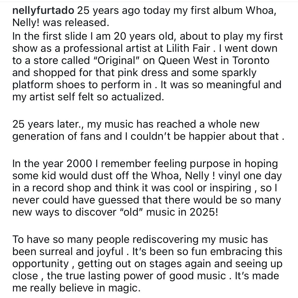 W oświadczeniu opublikowanym w mediach społecznościowych Furtado podkreśla, że po 25 latach koncertowania jej muzyka dotarła do całkiem nowego pokolenia fanów.