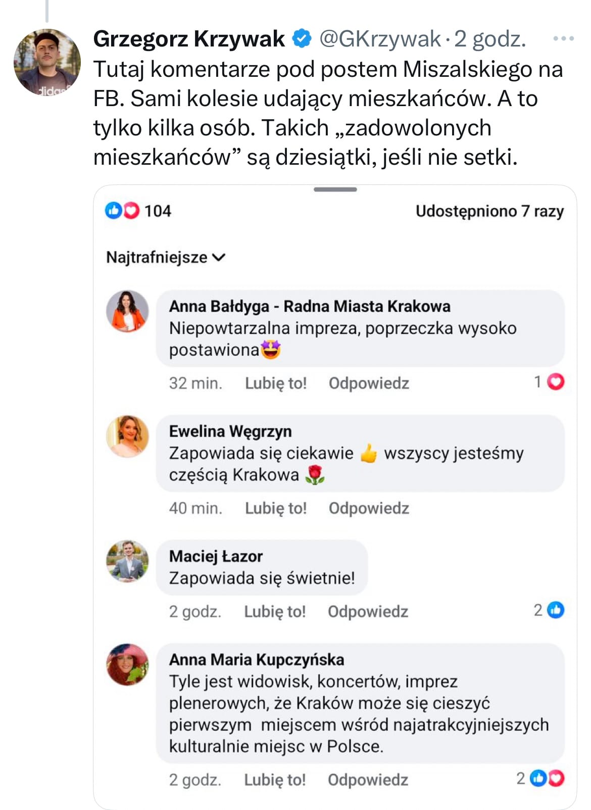 „Spójrzcie pod komentarze na Facebooku. Mnóstwo pochwał, komplementów, braw i wyrazów serdeczności. Ale to nie są zwykli mieszkańcy”