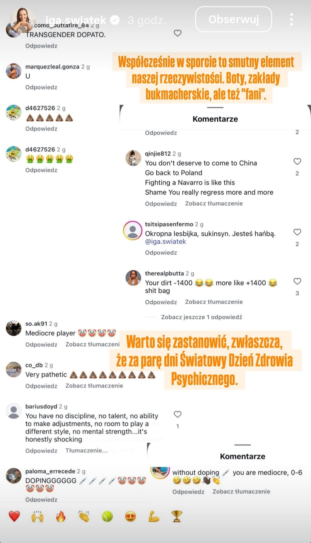Świątek wybrała kilka takich komentarzy na swój temat, które opublikowała na swoim Instagramie.