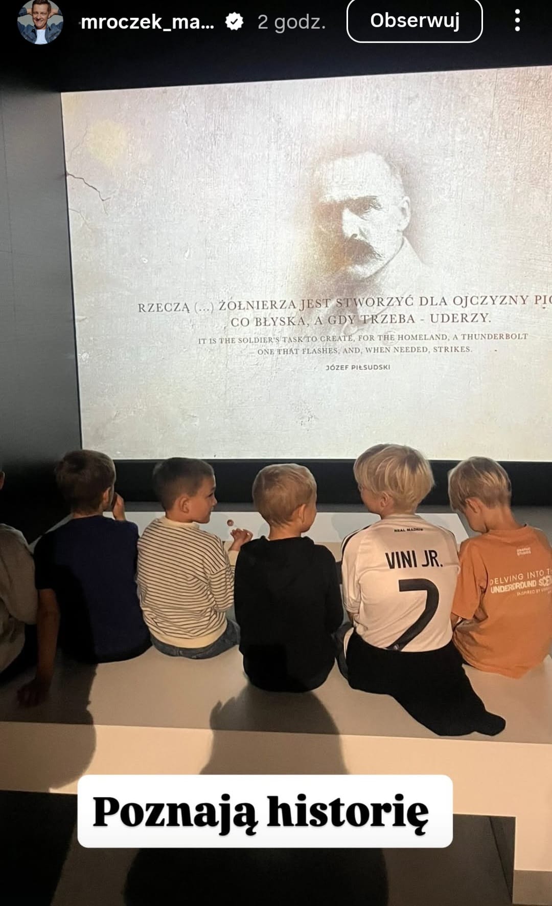 Z kolei aktor Marcin Mroczek zabrał dzieci do muzeum, w którym poznawały historię. Na opublikowanym przez niego na InstaStories zdjęciu widzimy, że dzieci między innymi poznawały cytat Józefa Piłsudskiego.