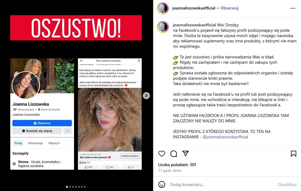Oszuści coraz śmielej wykorzystują wizerunek znanych polskich gwiazd. Tym razem na cel obrali Joannę Liszowską. Na Facebooku pojawił się fałszywy profil podszywający się pod aktorkę. Wykorzystując jej wizerunek reklamowane są między innymi suplementy diety.