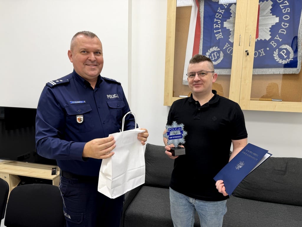 Za bohaterską postawę i opanowanie w skrajnie trudnej sytuacji kierowca został oficjalnie wyróżniony. Komendant Miejski Policji w Bydgoszczy mł. insp. Mariusz Gaik zaprosił go do komendy, podziękował za reakcję i wręczył list gratulacyjny wraz z upominkami.