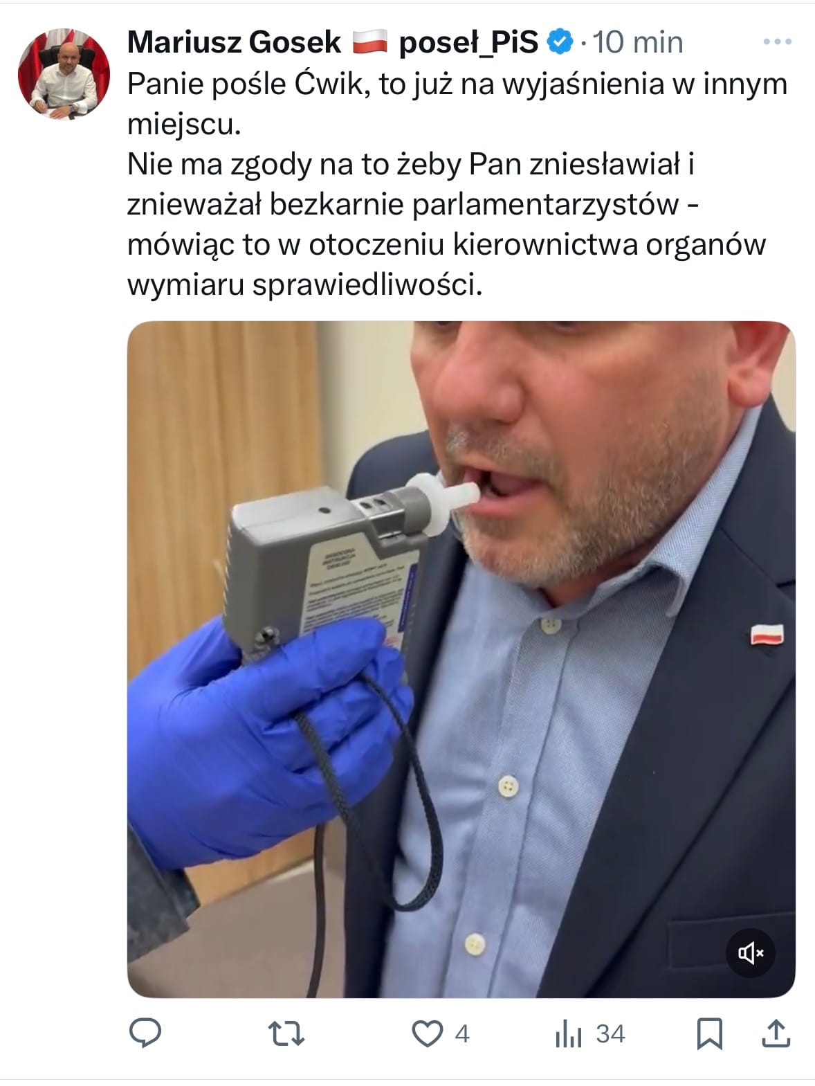 Poseł Gosek nawet zamieścił na platformie X nagranie z momentu badania, które nie stawierdziło obecności alkoholu.