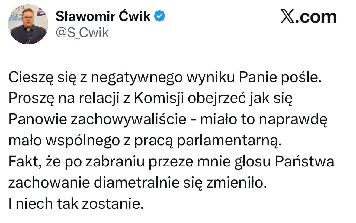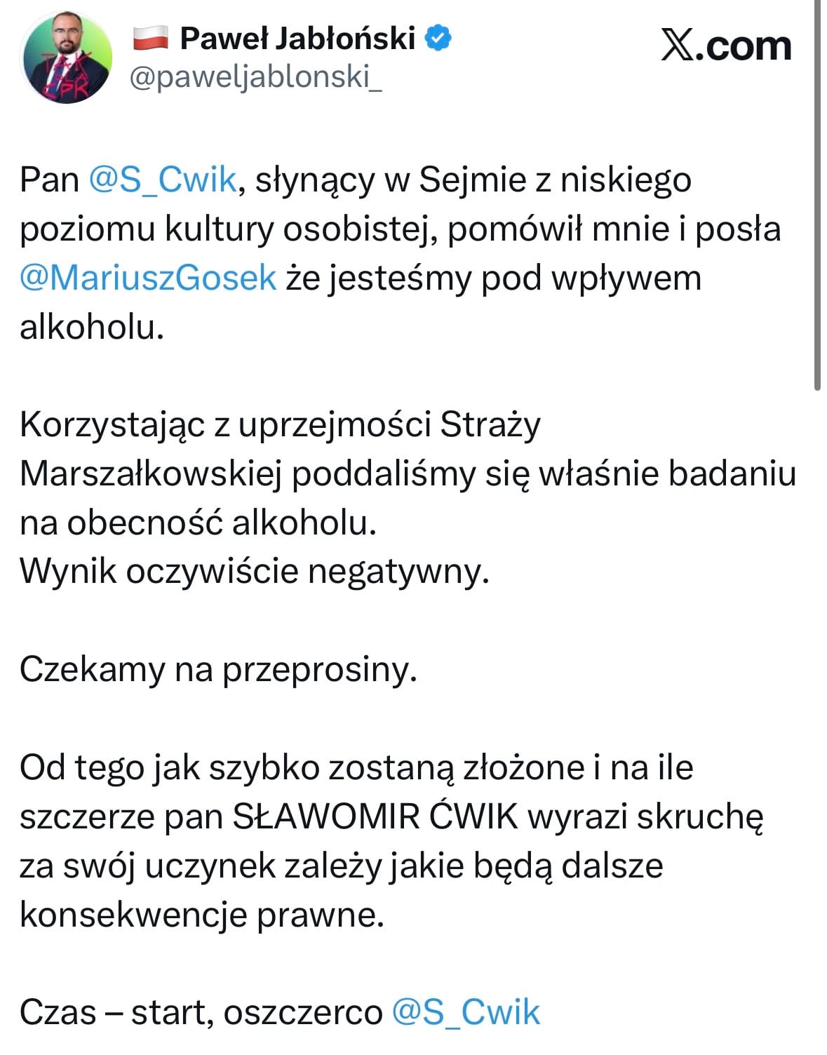 Pan Ćwik, słynący w Sejmie z niskiego poziomu kultury osobistej, pomówił mnie i posła Goska, że jesteśmy pod wpływem alkoholu