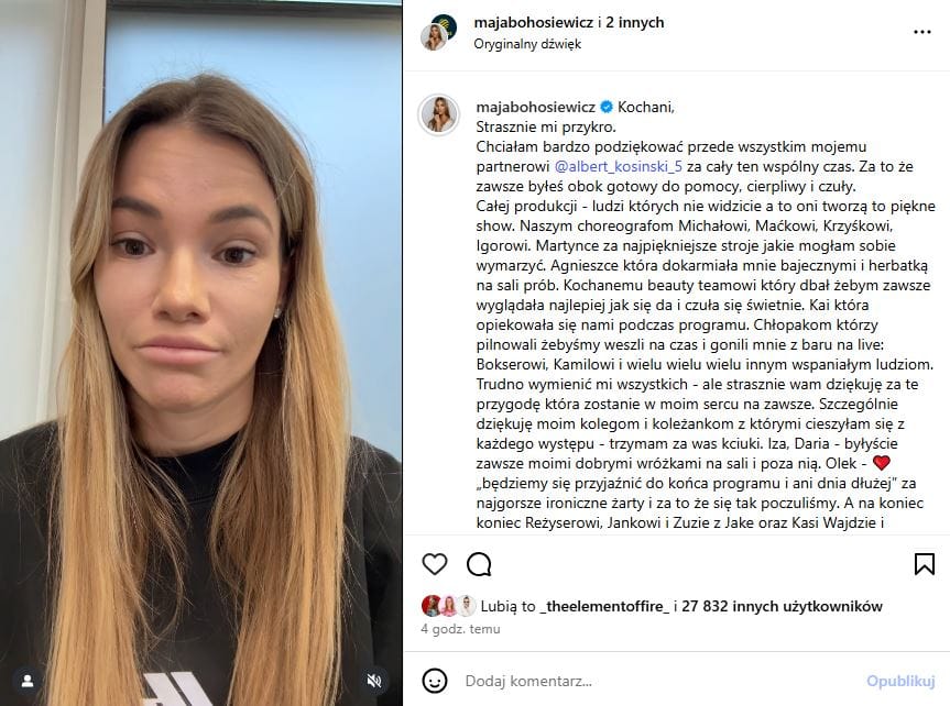 Kochani, strasznie mi przykro. Chciałam bardzo podziękować przede wszystkim mojemu partnerowi Albertowi Kosińskiemu za cały ten wspólny czas