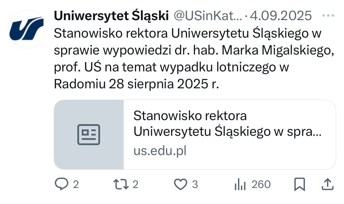Stanowczo potępiam treść i sposób oceny sformułowanej przez dr. hab. Marka Migalskiego, prof. UŚ w odniesieniu do tragicznej śmierci pilota samolotu F16 majora Macieja Krakowiana. Użyte tam określenia są krzywdzące, lekceważą dramat śmierci i straty osoby bliskiej wielu ludziom, a przede wszystkim zaprzeczają postawie oczekiwanej od naukowca i nauczyciela akademickiego, którego winny cechować szacunek dla innych oraz rzetelność argumentacyjna w wypowiedziach naukowych i publicznych