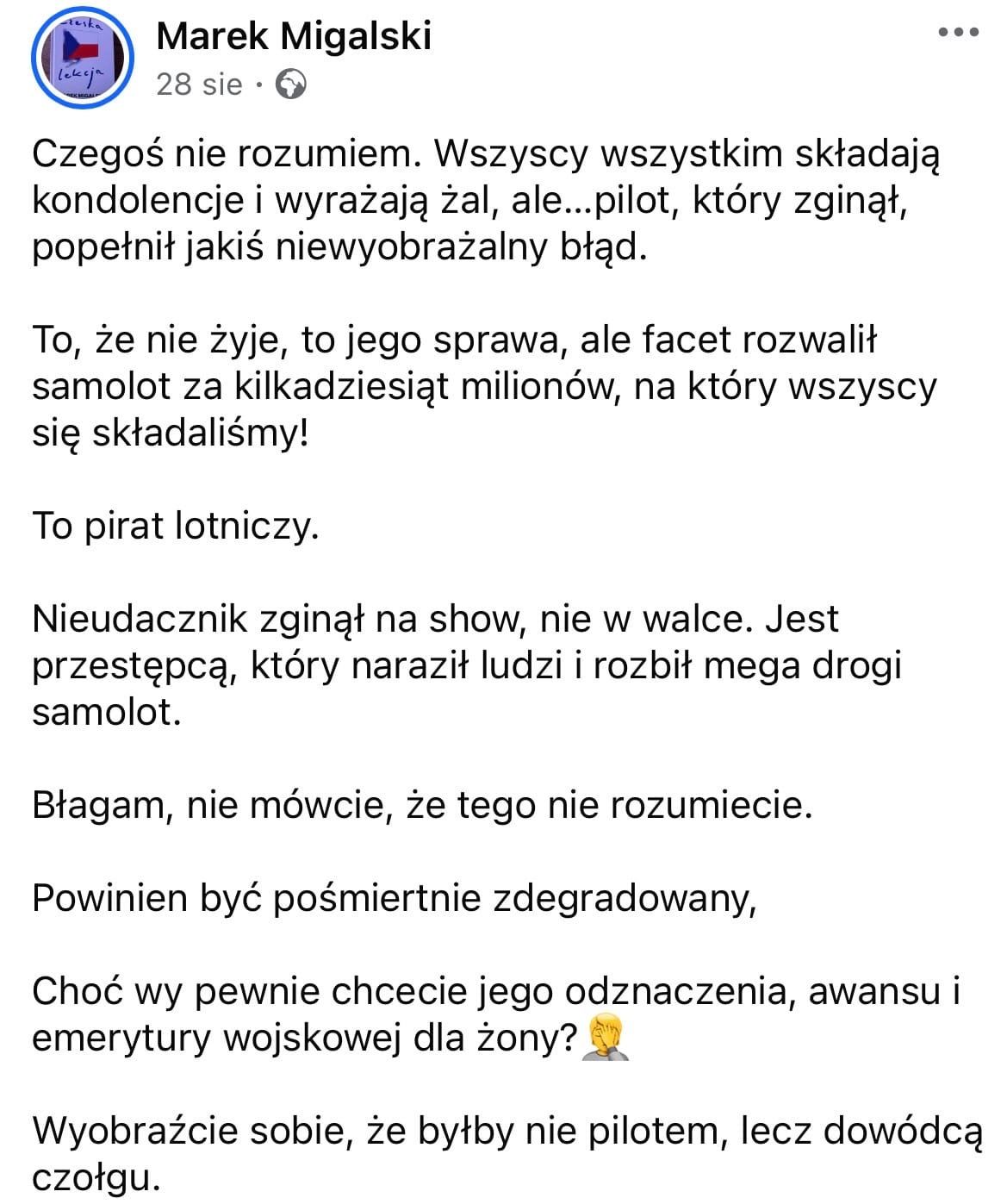 Gdy wszyscy wyrażali współczucie dla rodziny zmarłgo pilota, Migalski - wykładowca akademicki, komentator i były eurposeł - zdecydował się na komentarz w innym tonie.