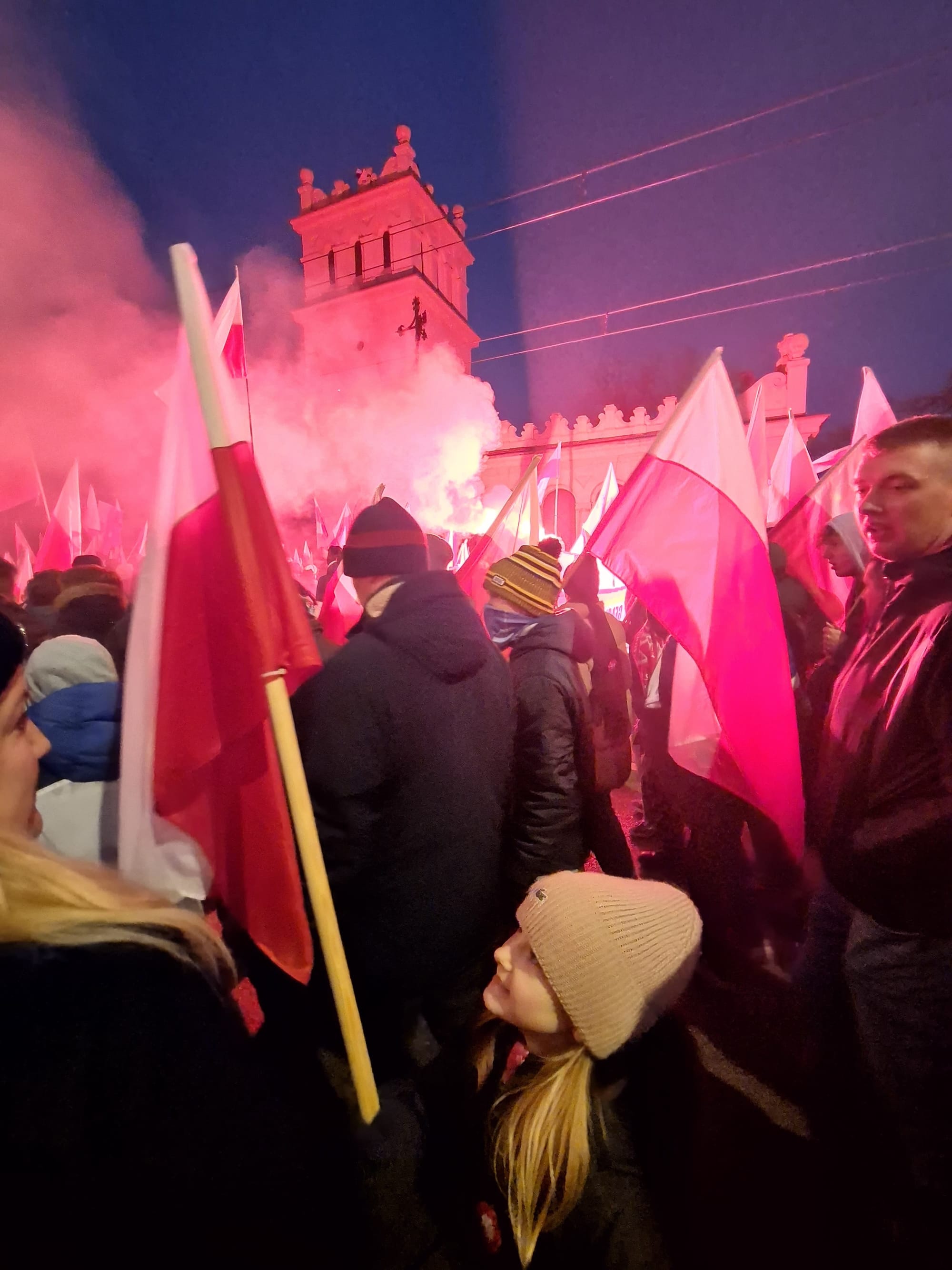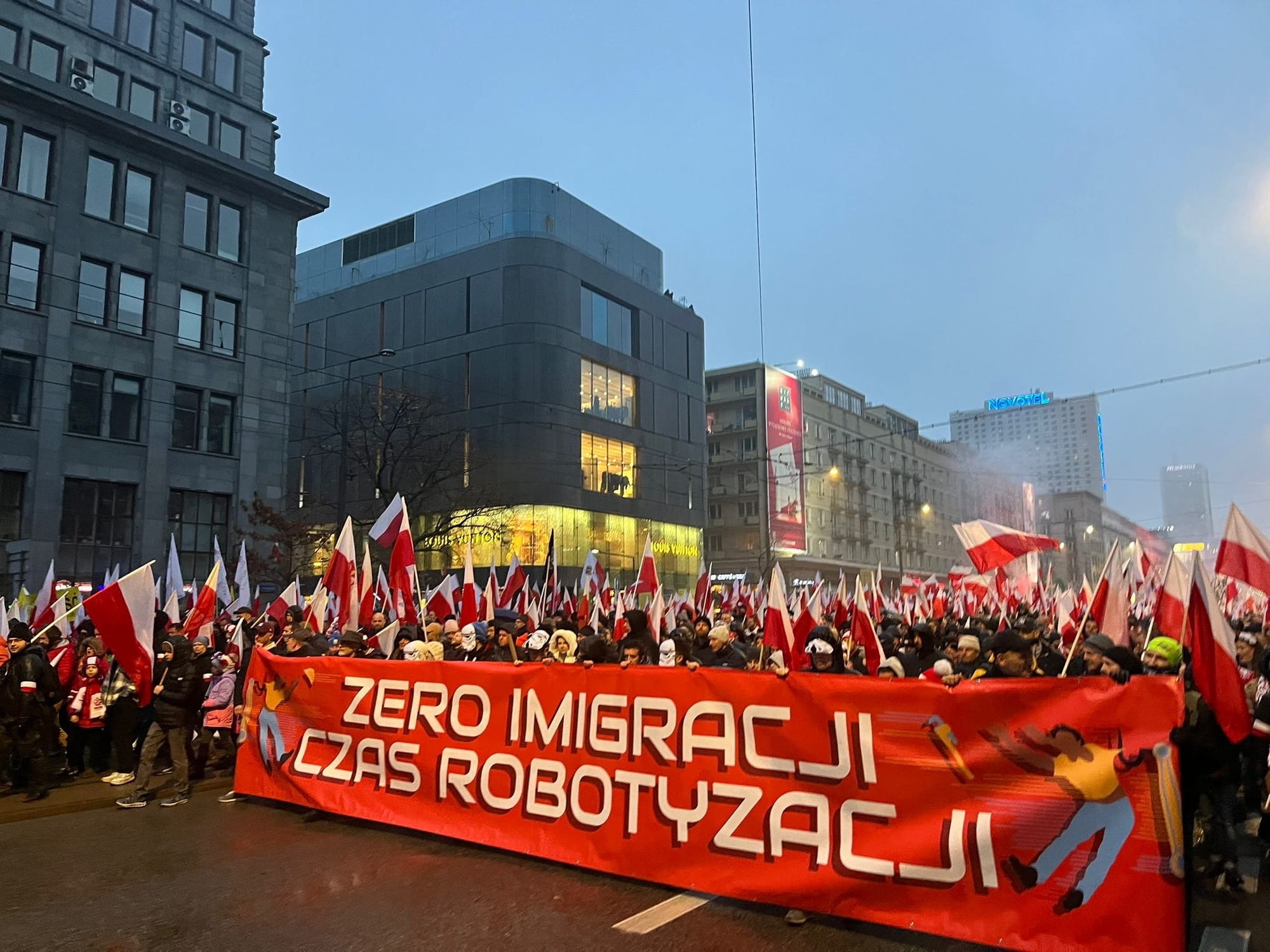 Wśród morza biało-czerwonych flag, patriotycznych okrzyków i rodzin z dziećmi, naszą uwagę przykuł jeden szczególny transparent. Nie tylko dlatego, że był największy, mierzył aż 9 metrów długości i 1,6 metra wysokości, ale przede wszystkim przez swój zaskakujący przekaz: „ZERO IMIGRACJI CZAS ROBOTYZACJI”. Zatrzymywał przechodniów, wzbudzał dyskusje, a niektórzy robili sobie z nim zdjęcia jak ze znanym celebrytą.