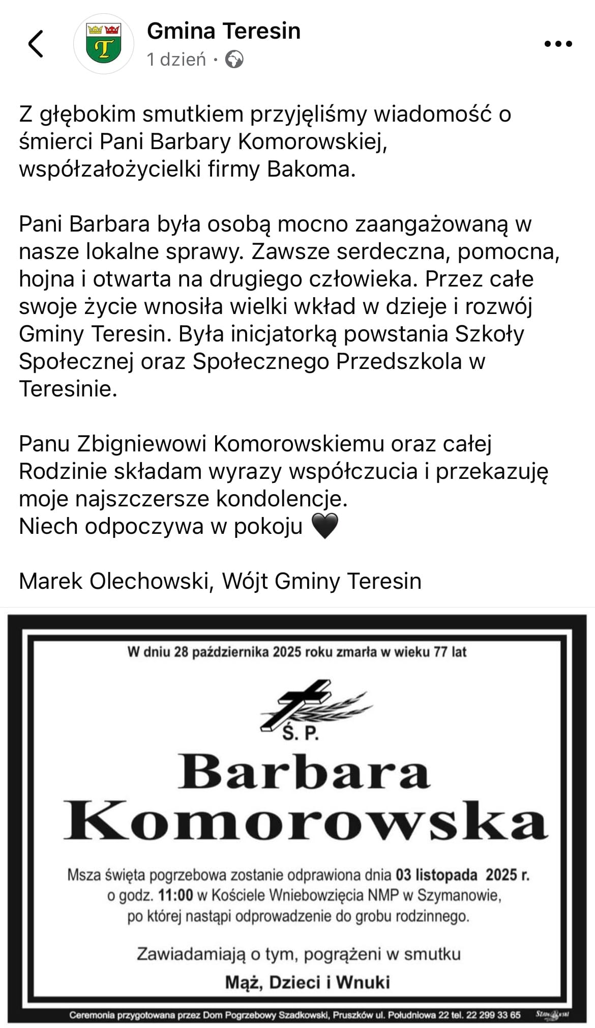Barbara Komorowska była współtwórczynią firmy Bakoma – jednej z najbardziej rozpoznawalnych marek mleczarskich w Polsce. Jej śmierć poruszyła nie tylko świat biznesu, ale przede wszystkim mieszkańców Teresina, gdzie przez lata angażowała się w edukację, pomoc społeczną i rozwój lokalnych inicjatyw.