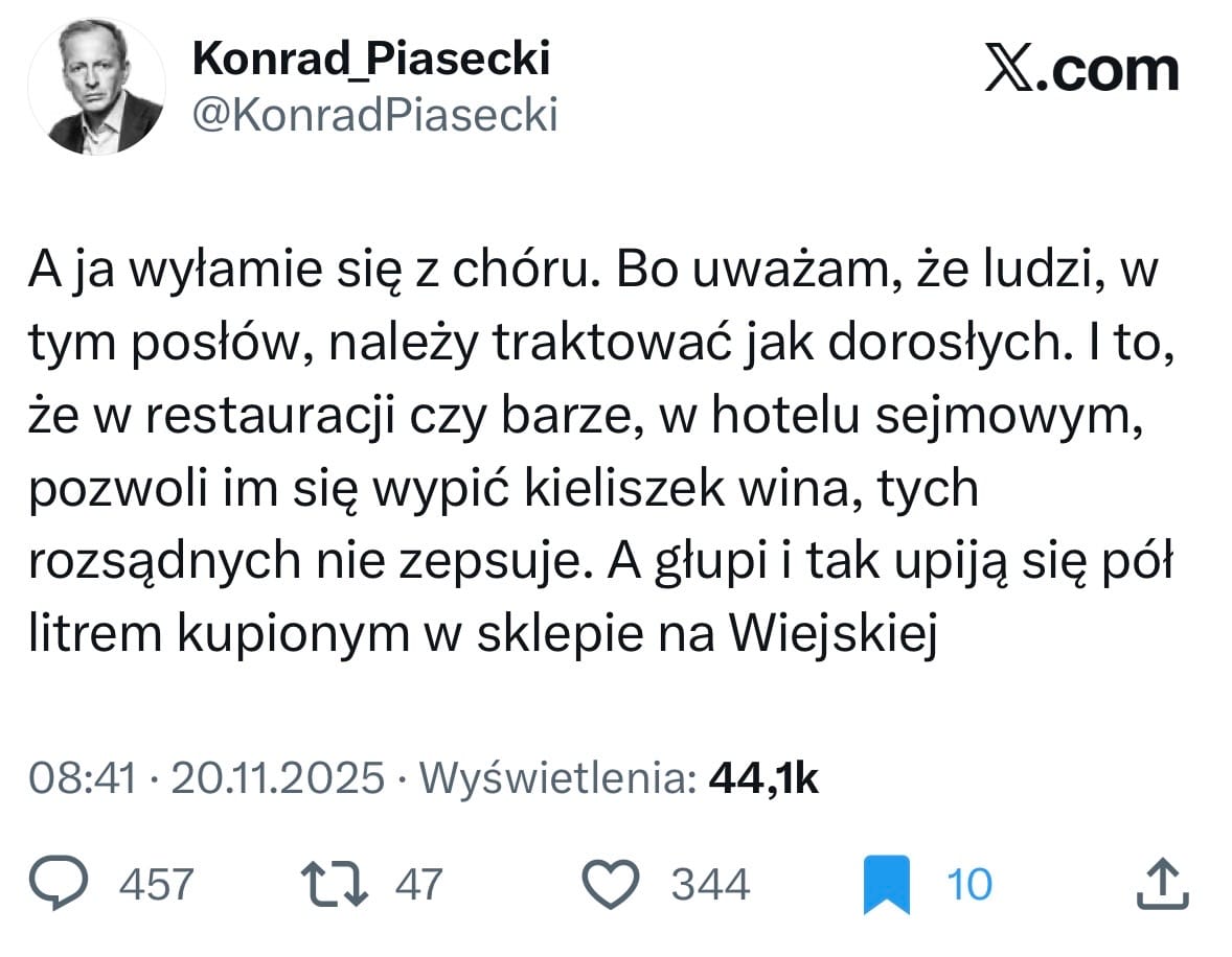 A ja wyłamię się z chóru. Bo uważam, że ludzi, w tym posłów, należy traktować jak dorosłych. I to, że w restauracji czy barze, w hotelu sejmowym pozwoli im się wypić kieliszek wina, tych rozsądnych nie zepsuje. A głupi i tak upiją się pół litrem kupionym w sklepie na Wiejskiej