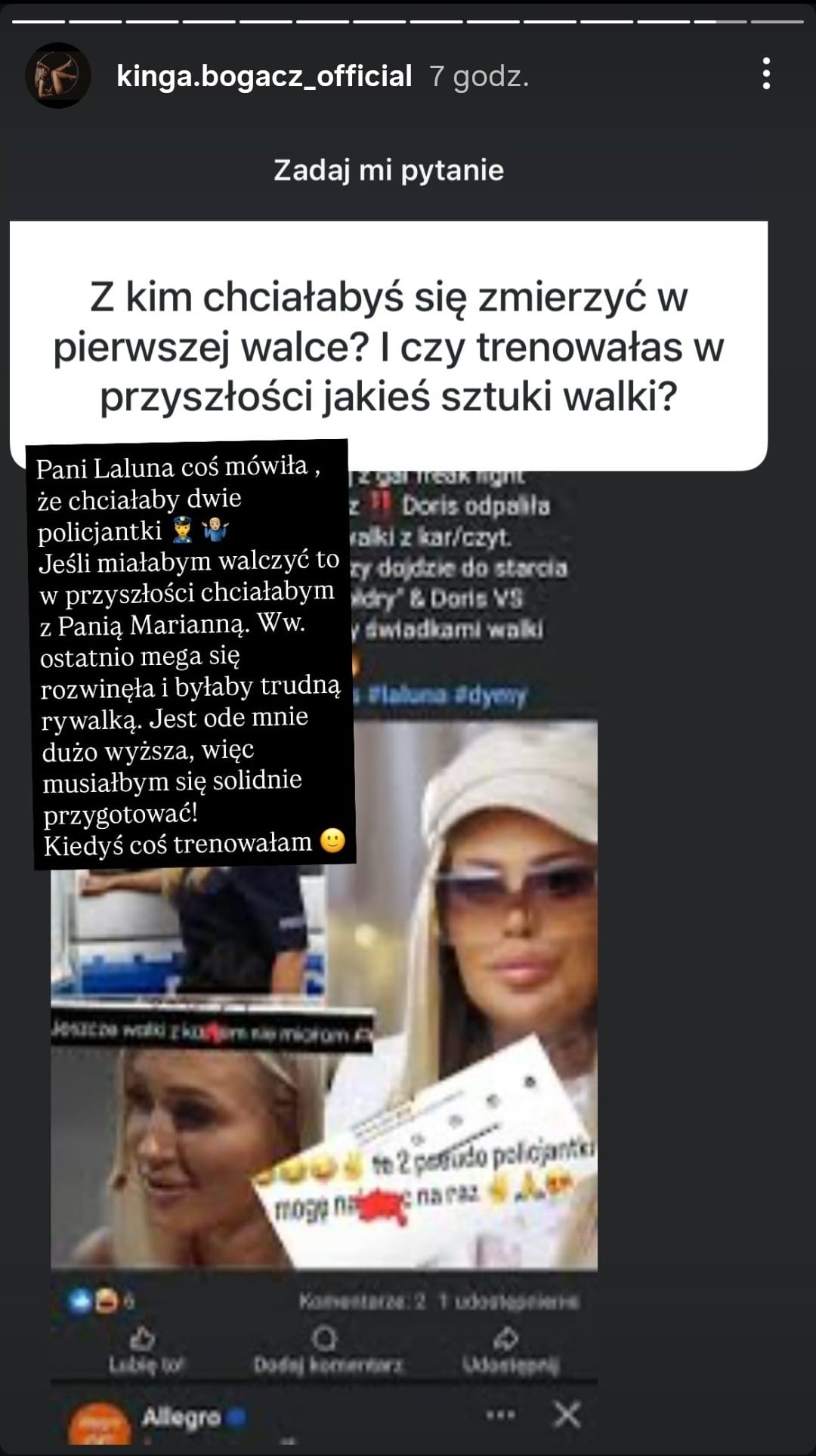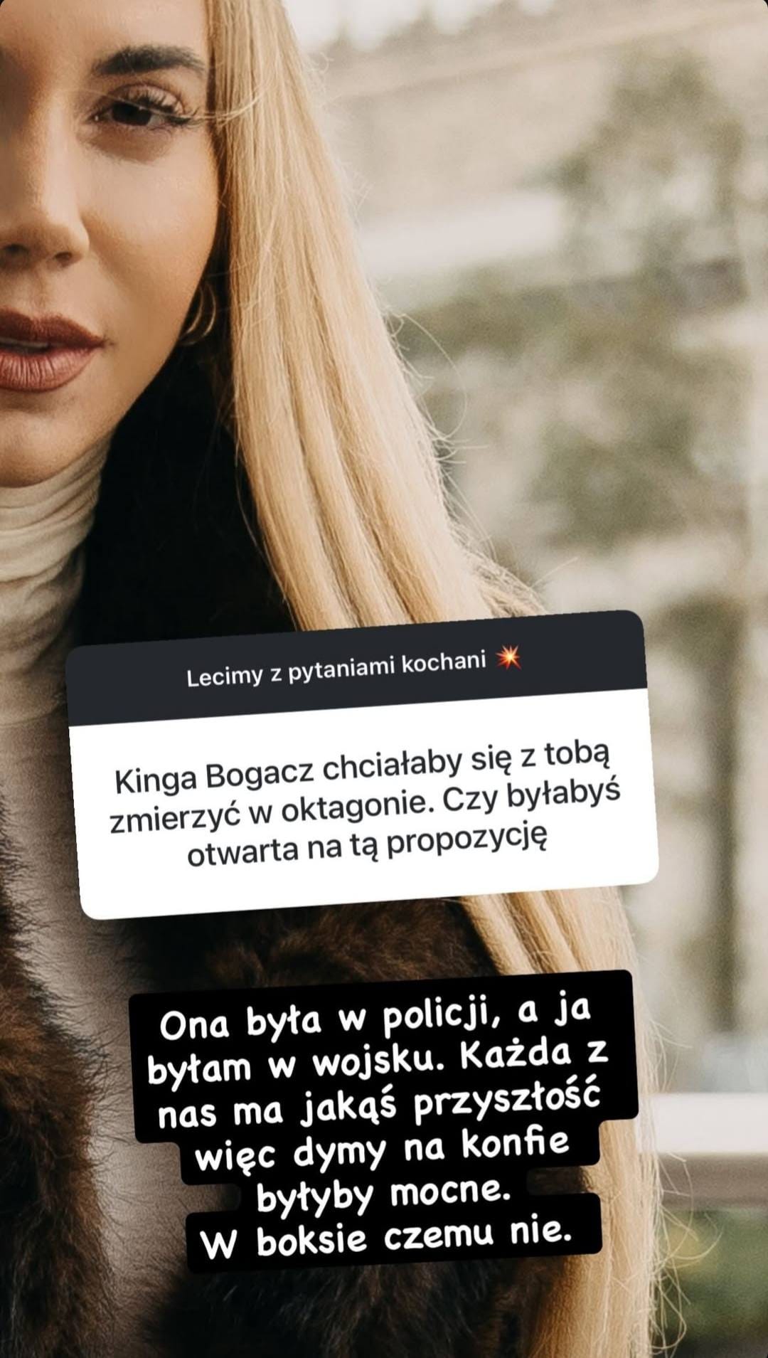 Znana w mediach jako "policjantka spod kołdry" Kinga Bogacz została zapytana na Instagramie z kim chciałaby stoczyć swoją pierwszą walkę w oktagonie. Policjantka bez wahania odparła, że byłaby to Marianna Schreiber.