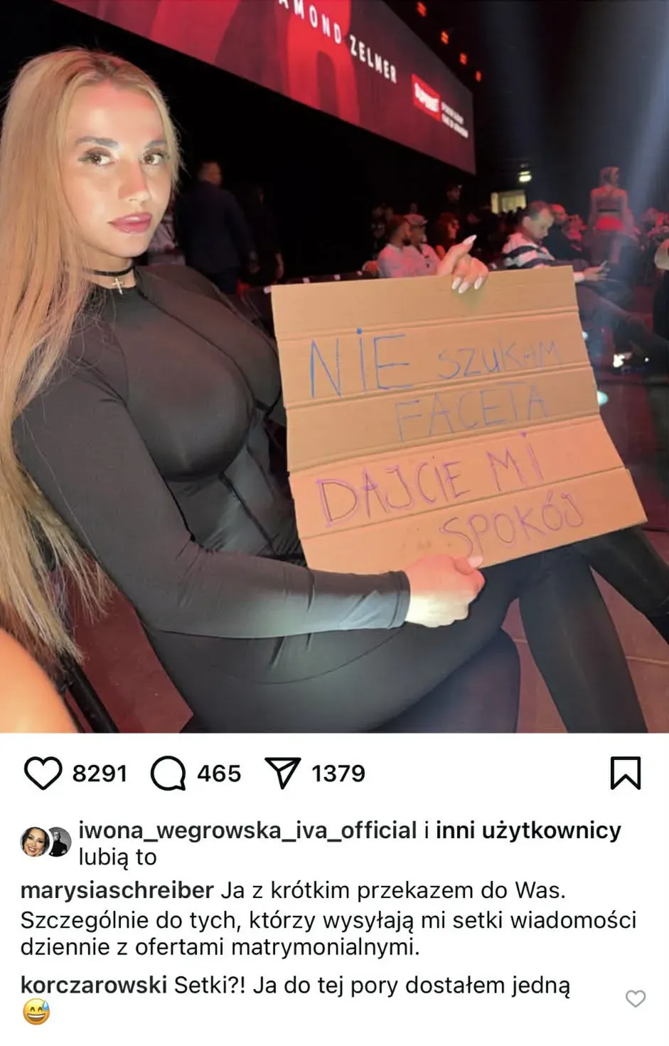 Pod najnowszym postem Schreiber pojawił się komentarz Piotra Korczarowskiego. Były partner celebrytki – znany z działalności publicystycznej i politycznej – przyznał z rozbrajającą szczerością, że jego własne „statystyki” wyglądają znacznie skromniej. Odpowiadając na przechwałki Marianny, napisał tylko: