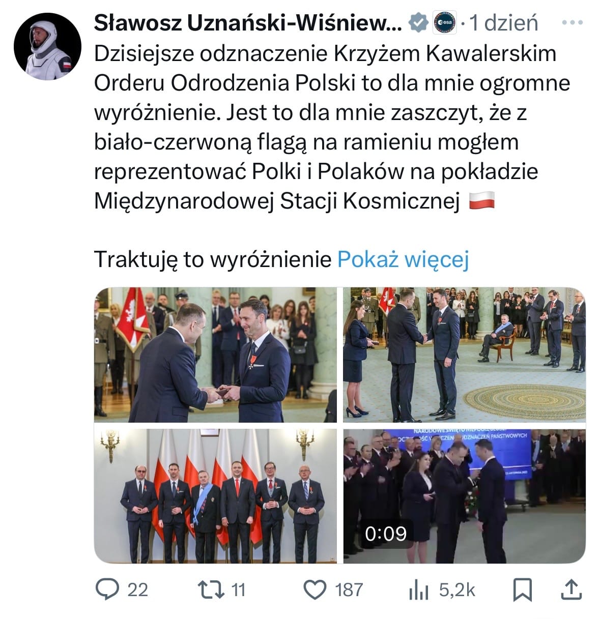 11 listopada Sławosz Uznański-Wiśniewski (41 l.) został odzaczony za wybitne zasługi dla rozwoju badań kosmicznych, za rozsławianie imienia Polski w świecie.