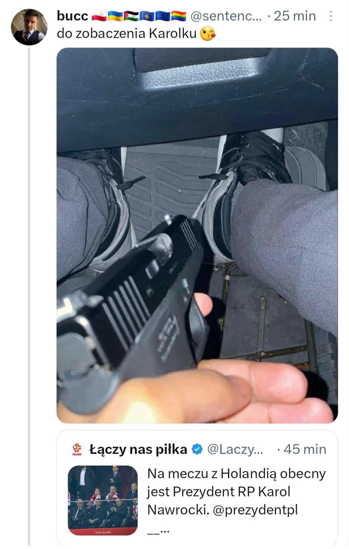 Na platformie X jeden z użytkowników zamieścił zdjęcie broni z podpisem „do zobaczenia Karolku”. Post był odpowiedzią na zdjęcie prezydenta opublikowane przez profil „Łączy nas Piłka”.
