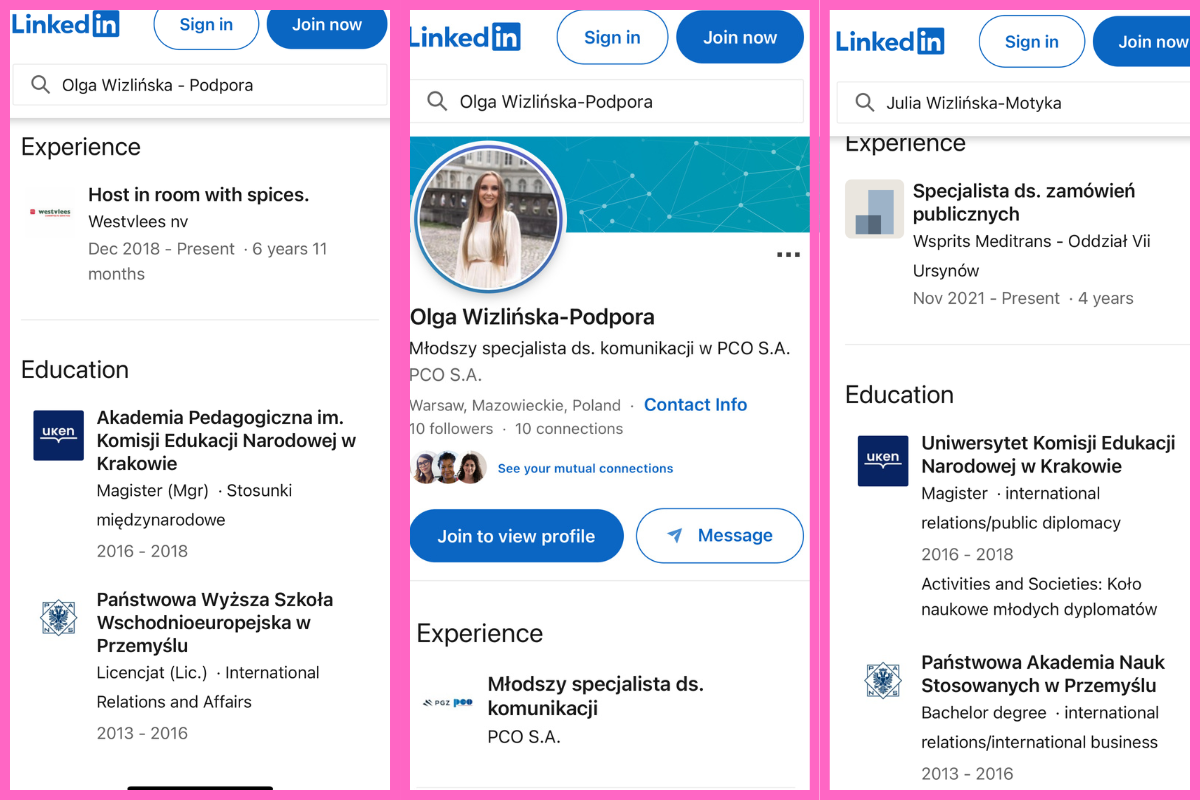 Skąd wiadomo, że oba konta należą do tej samej osoby? W profilu bez zdjęcia widnieją te same uczelnie, ukończone w tych samych latach co przez jej siostrę — Julię Wizlińską-Motykę, żonę ministra energii. Więc pochodzące z Ukrainy siostry, studiowały razem.