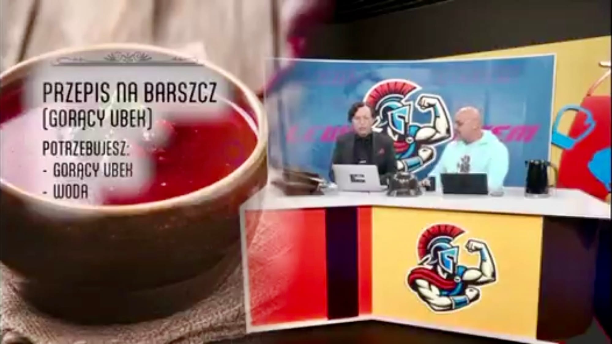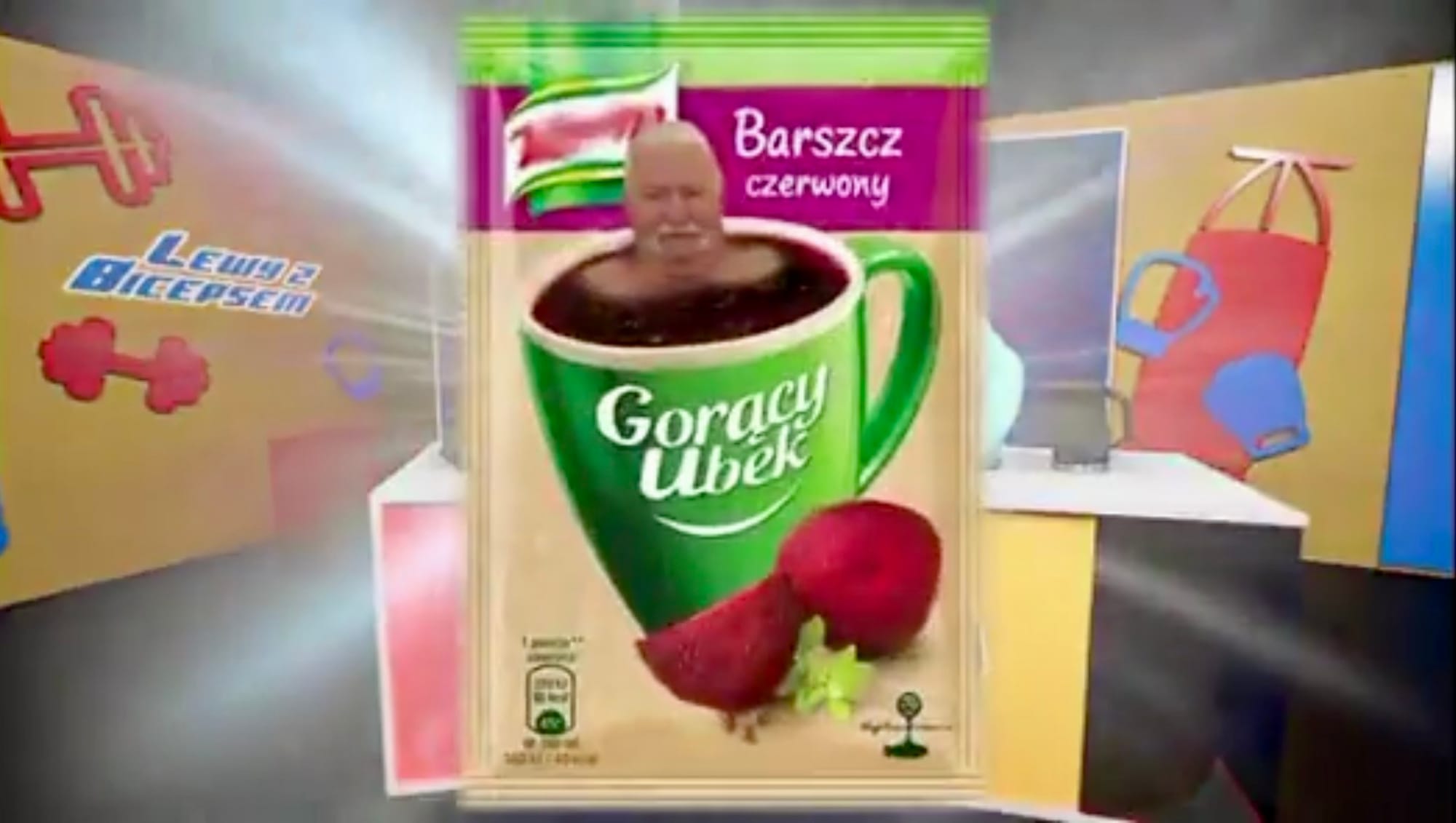 Na wizji Woś i Jastrzębowski przygotowali zupkę instant o nazwie gorący kubek, znanej i popularnej marki spożywczej. Na opakowaniu znalazła się podobizna byłego prezydenta Lecha Wałęsy.